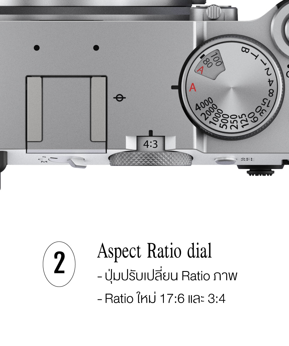 'แป้นหมุนเลือกสัดส่วนภาพ' (Aspect Ratio Dial) ที่ช่วยให้คุณสามารถปรับเปลี่ยนรูปแบบการถ่ายภาพที่หลากหลายถึง 9 รูปแบบ และพิเศษคือ Fujifilm ได้เพิ่มสัดส่วนภาพ '3:4' และ '17:6' เพื่อเป็นตัวเลือกสัดส่วนภาพให้เข้ากับสิ่งที่ต้องการถ่ายของคุณ ทำให้การถ่ายภาพสนุกยิ่งขึ้น