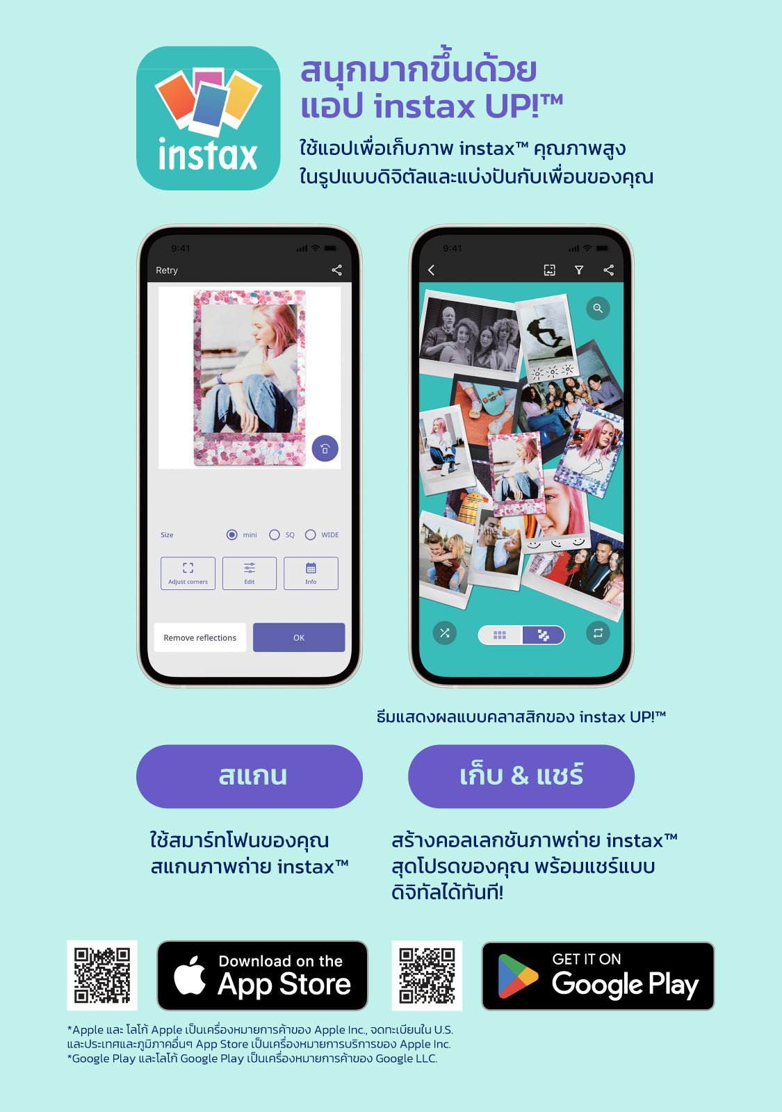 ฟิล์ม instax ขนาด mini ถูกผลิตเพื่อใช้กับกล้อง และปริ้นเตอร์ instax mini ทุกรุ่น ให้การถ่ายภาพด่วนสนุกขึ้น ด้วยขนาดเล็กเท่ากับบัตรเครดิต สามารถ พกภาพถ่ายไว้ในกระเป๋าสตางค์ หรือกรอบภาพขนาดเล็ก ให้ภาพสวยคมชัด สีสันที่สดใส และสีผิวที่เป็นธรรมชาติ สีของภาพมีความสม่ำเสมอ เหมือนภาพที่ถ่ายด้วยกล้องทั่วไป และด้วยชั้นอิมัลชั่นใหม่ที่มีประสิทธิภาพสูง ทำให้สามารถใช้งานได้ในอุณหภูมิต่ำถึง 5°C และสูงถึง 40°C ฟิล์มถ่ายแล้วอยู่ได้นานถึง 80 ปี 1 กล่องมีฟิล์ม 10 แผ่น ข้อคววรระวัง เก็บรับษาฟิล์มไว้ในที่ซึ่งไม่โดนแสงแดด ความชื้นน้อย และมีอุณหภูมิพอเหมาะ ประมาณ 5 - 40 °C