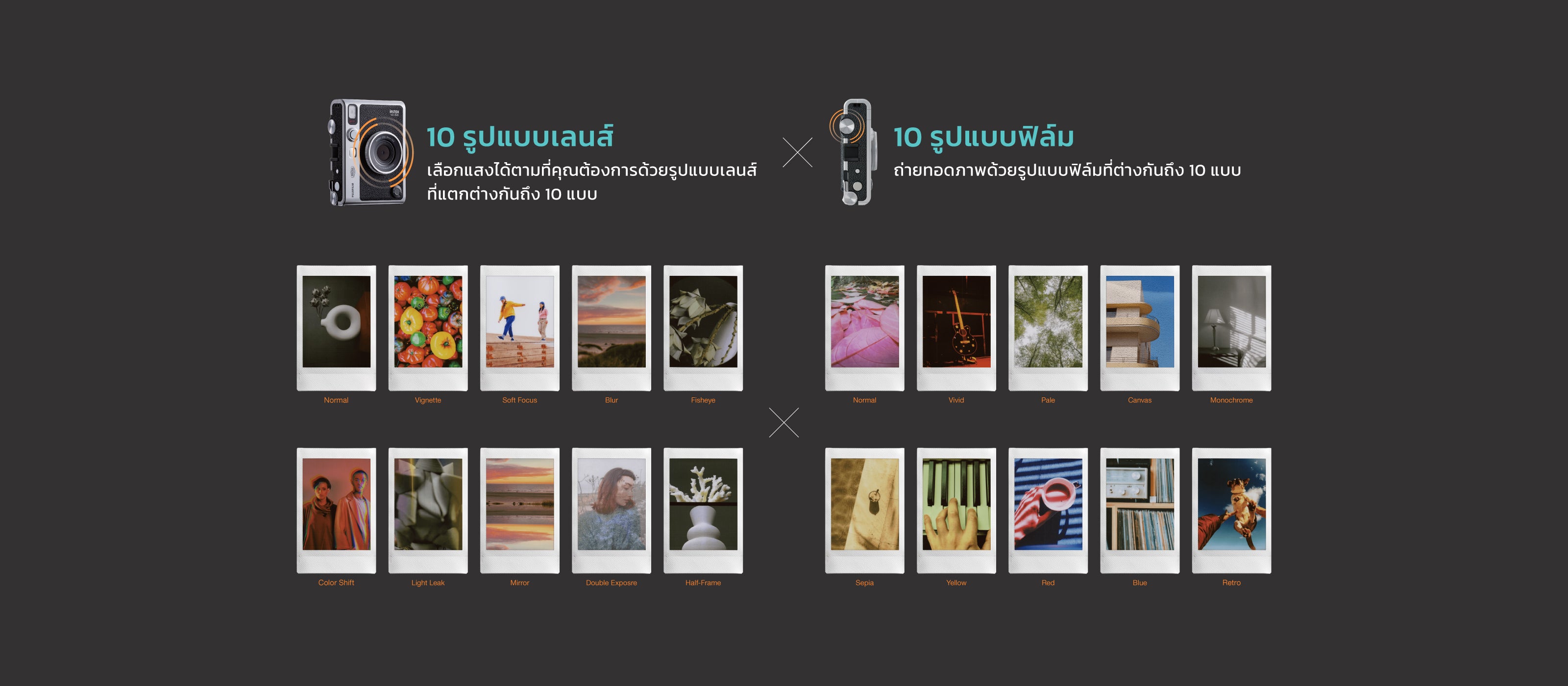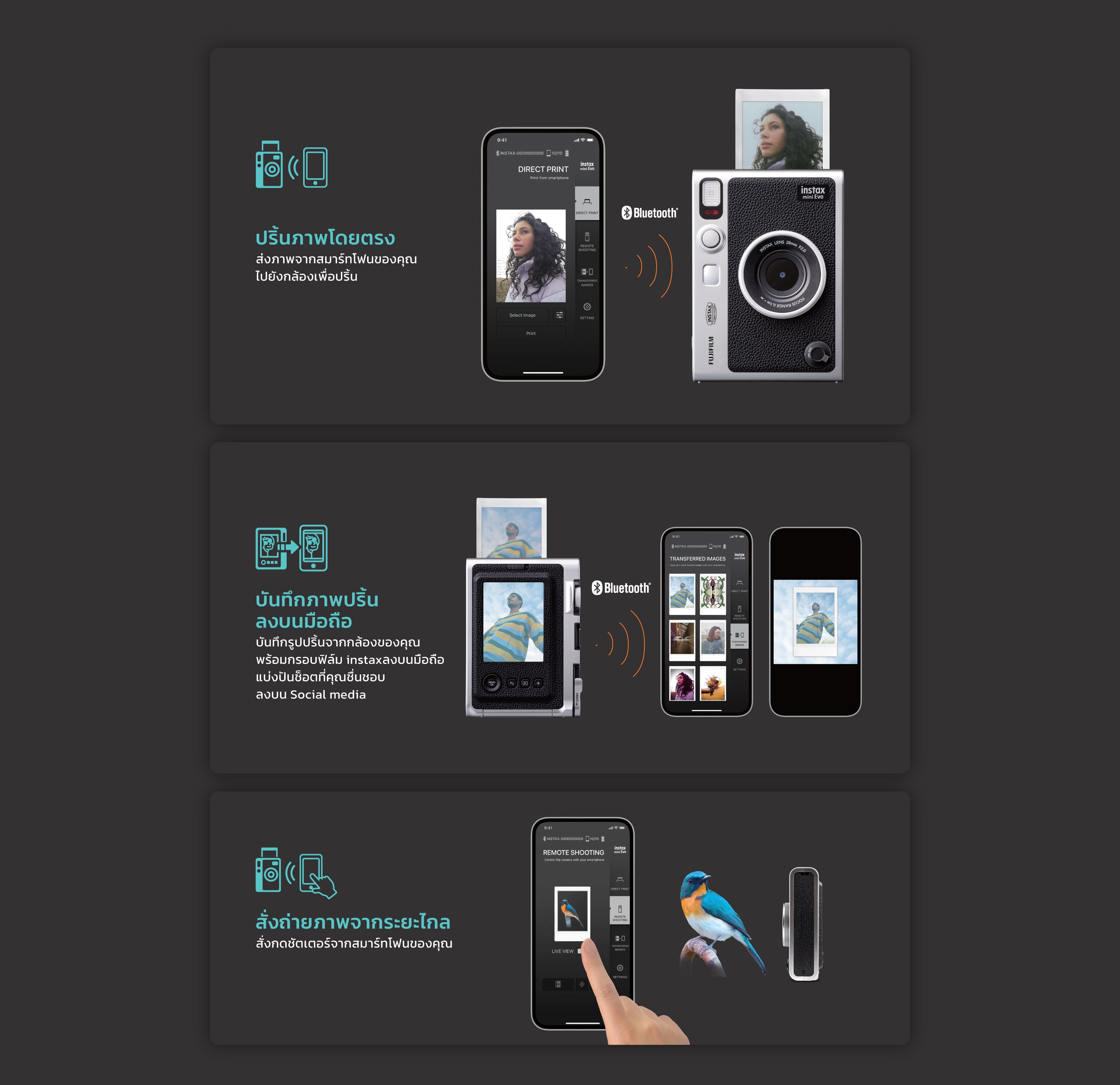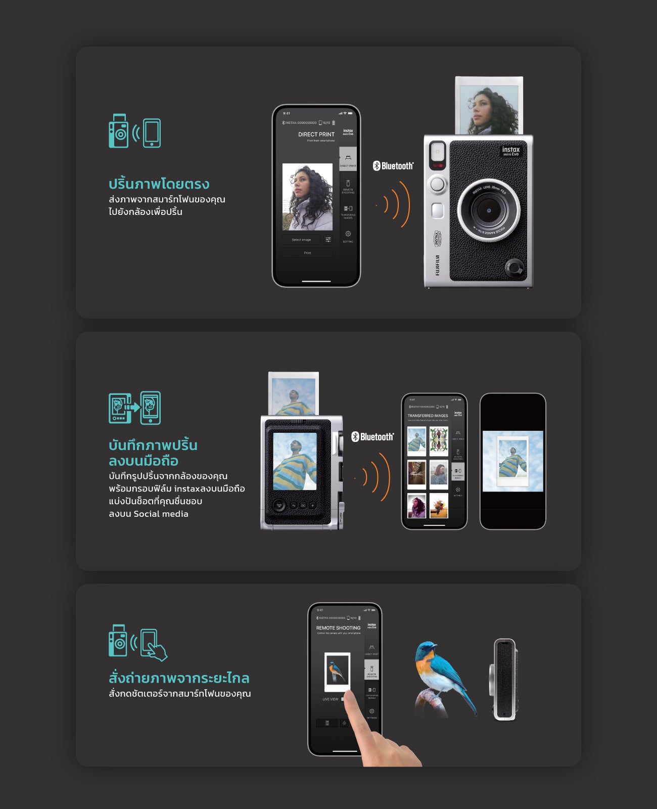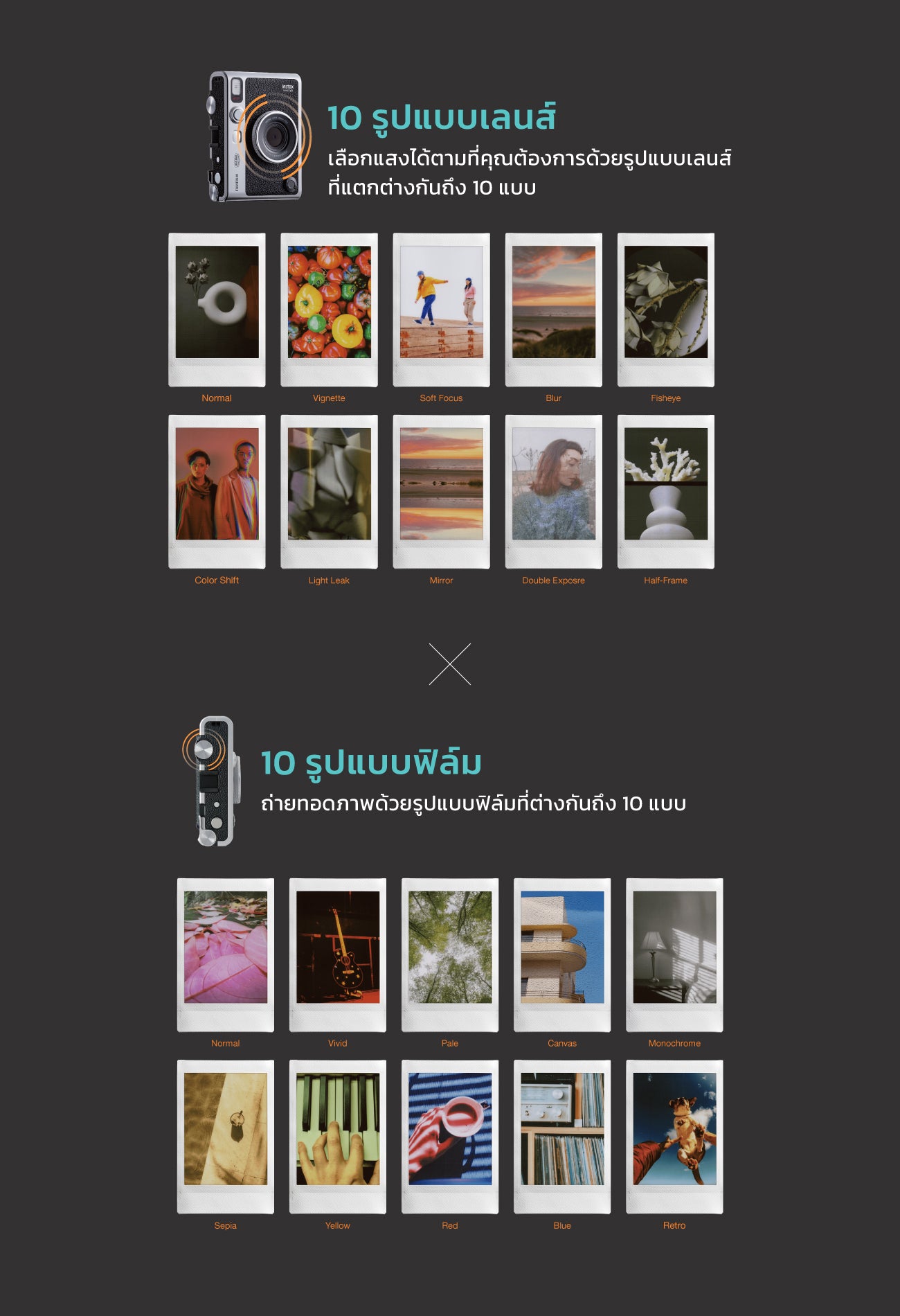 กล้องอินสแตนท์รูปแบบฟิล์มขนาด mini จะถ่ายหรือปริ้นก็ทำได้ง่ายๆ ทั้งถ่ายและแชร์รูปผ่านบลูทูธบนแอพพลิเคชั่น สนุกไม่ซ้ำใครกับรูปแบบเลนส์ 10 รูปแบบ และรูปแบบฟิล์ม 10 รูปแบบ ให้คุณสร้างสรรคภาพได้ถึง 100 รูปแบบ