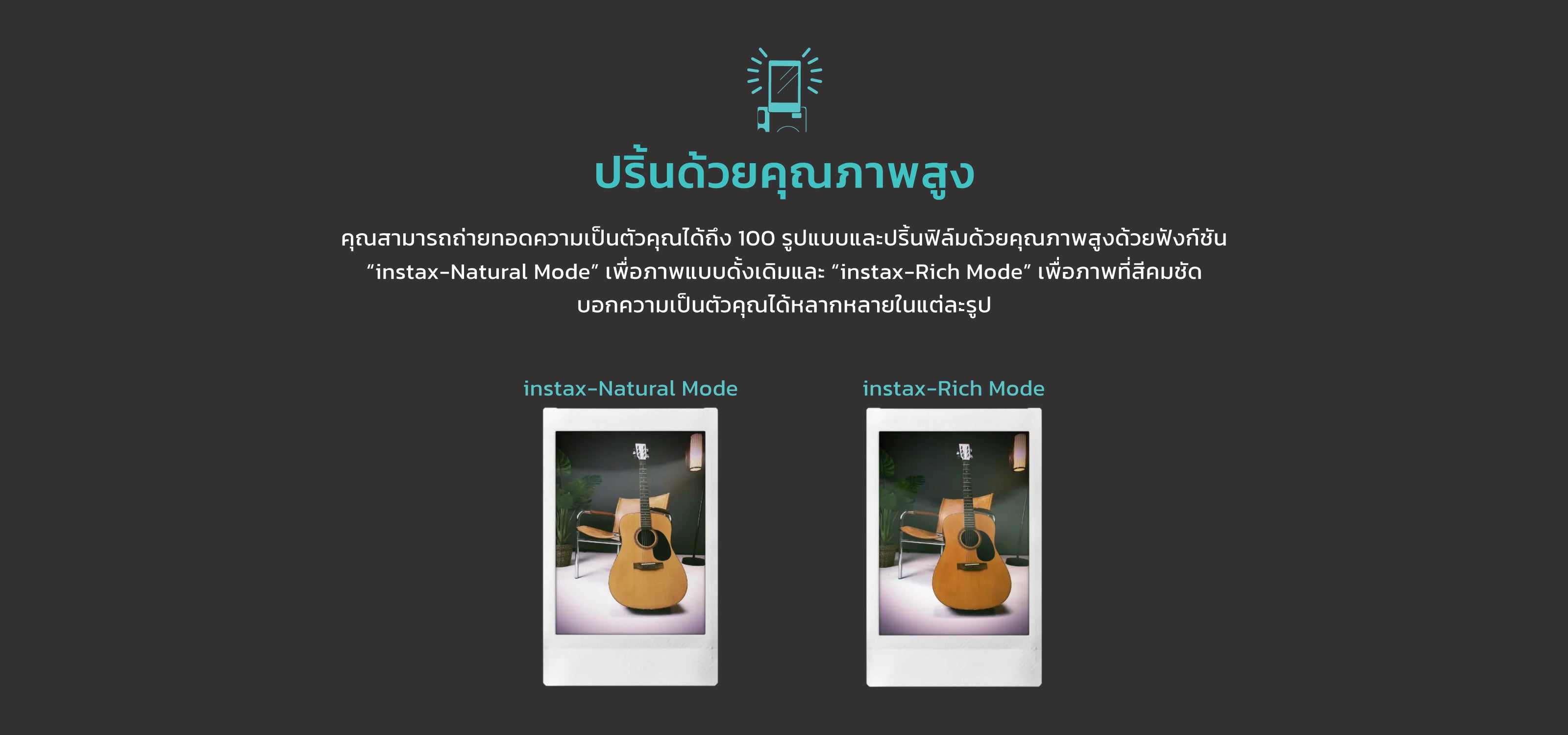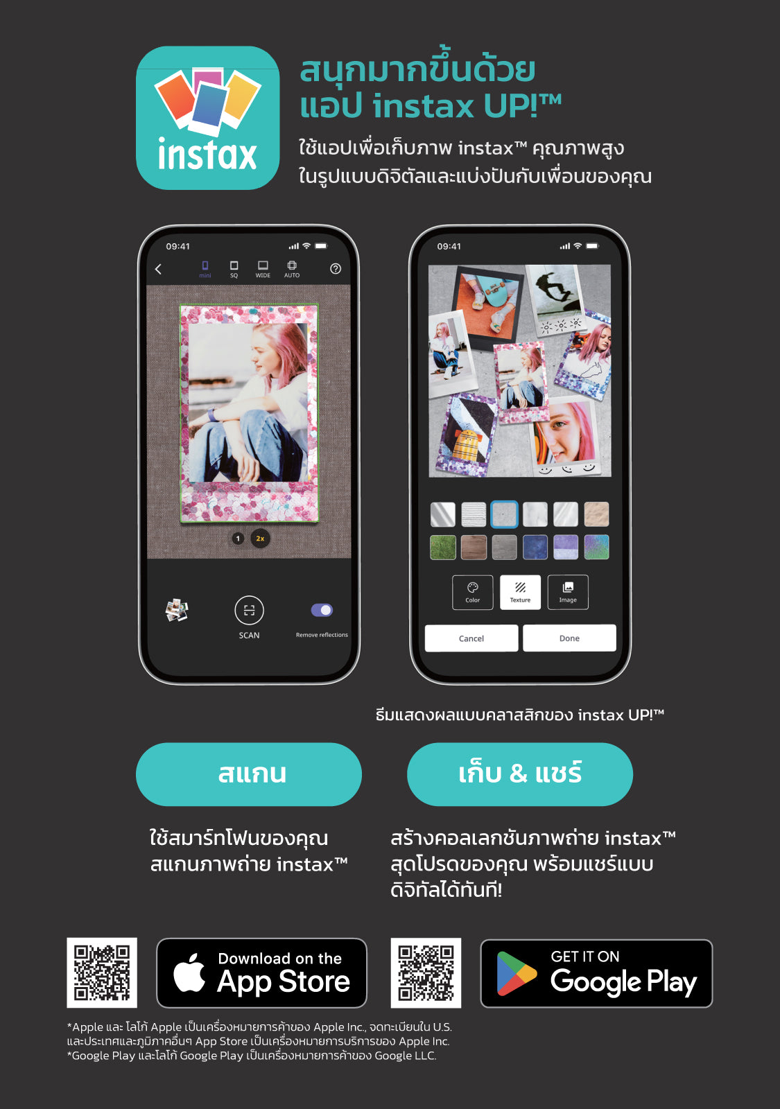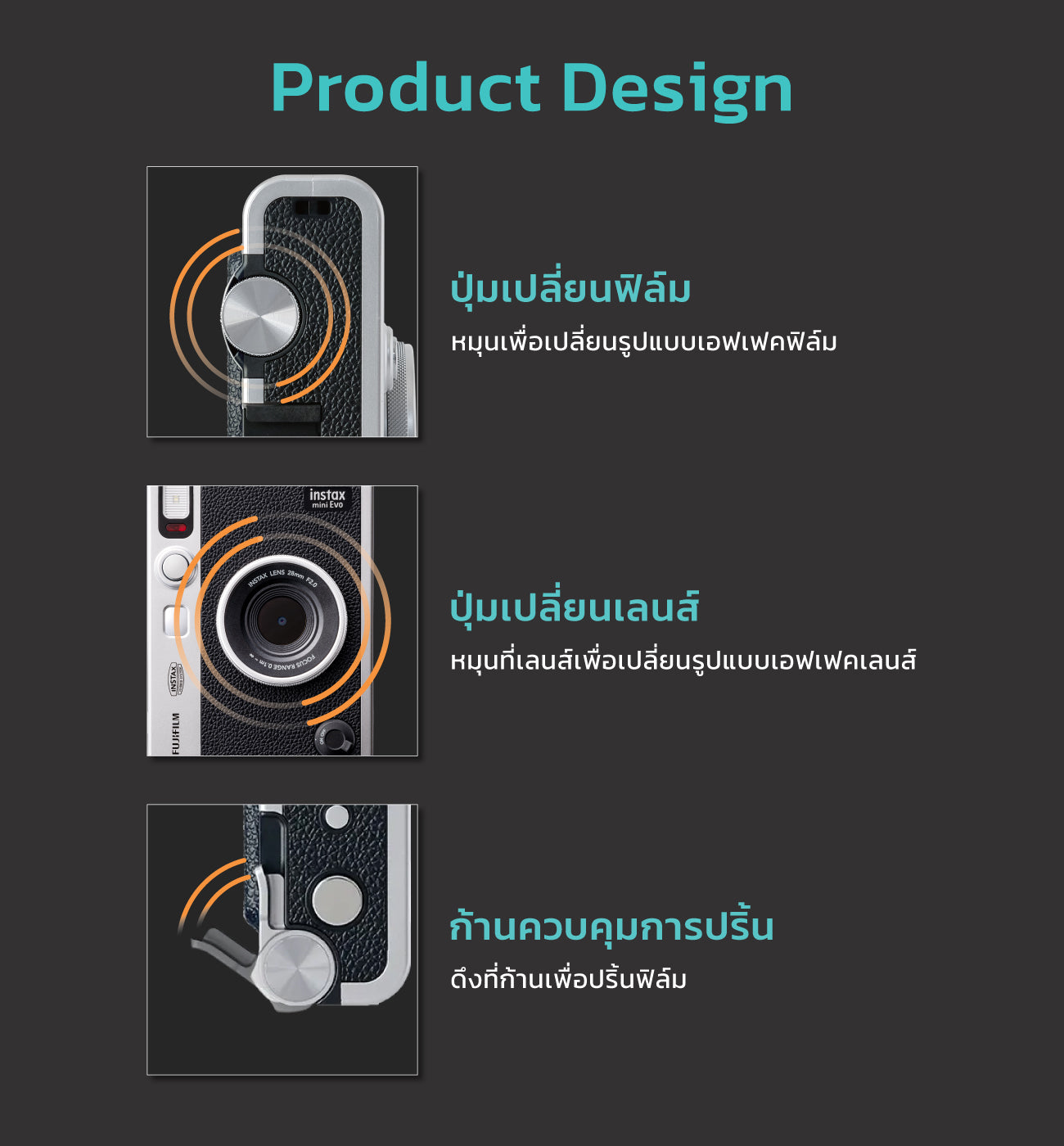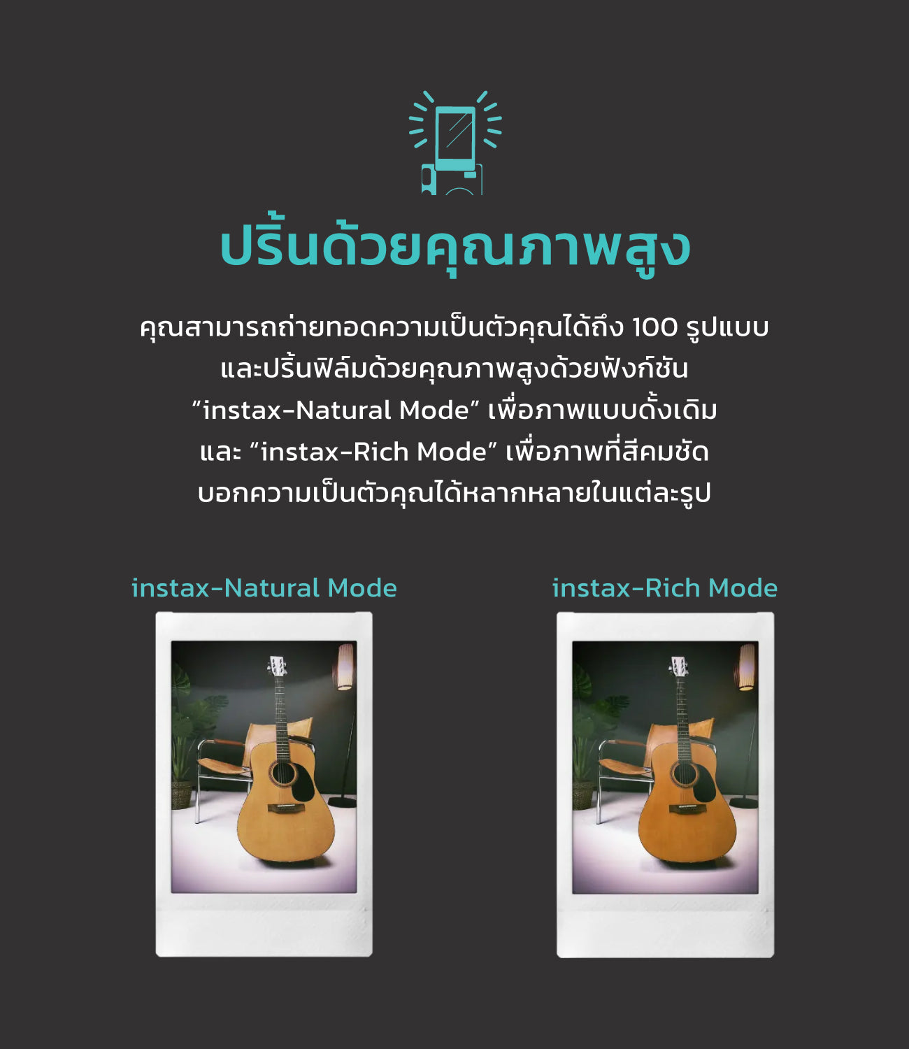 กล้องอินสแตนท์รูปแบบฟิล์มขนาด mini จะถ่ายหรือปริ้นก็ทำได้ง่ายๆ ทั้งถ่ายและแชร์รูปผ่านบลูทูธบนแอพพลิเคชั่น สนุกไม่ซ้ำใครกับรูปแบบเลนส์ 10 รูปแบบ และรูปแบบฟิล์ม 10 รูปแบบ ให้คุณสร้างสรรคภาพได้ถึง 100 รูปแบบ