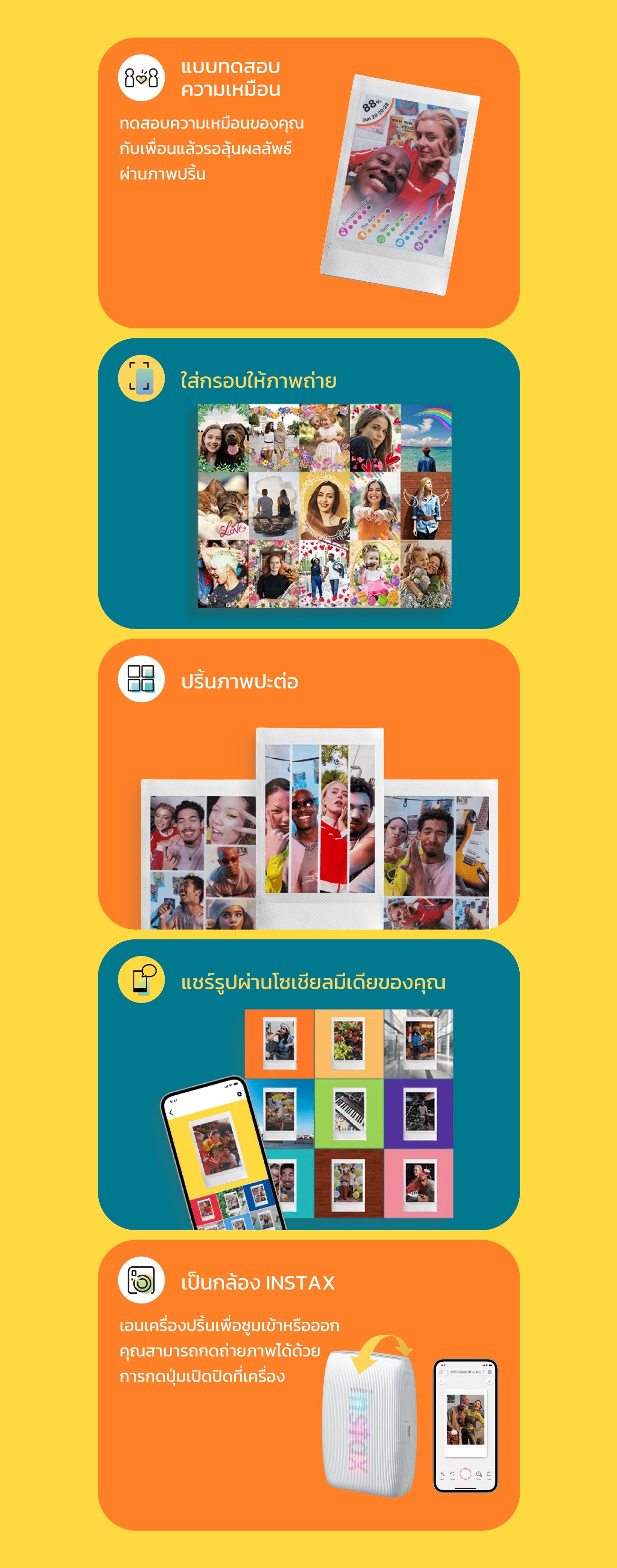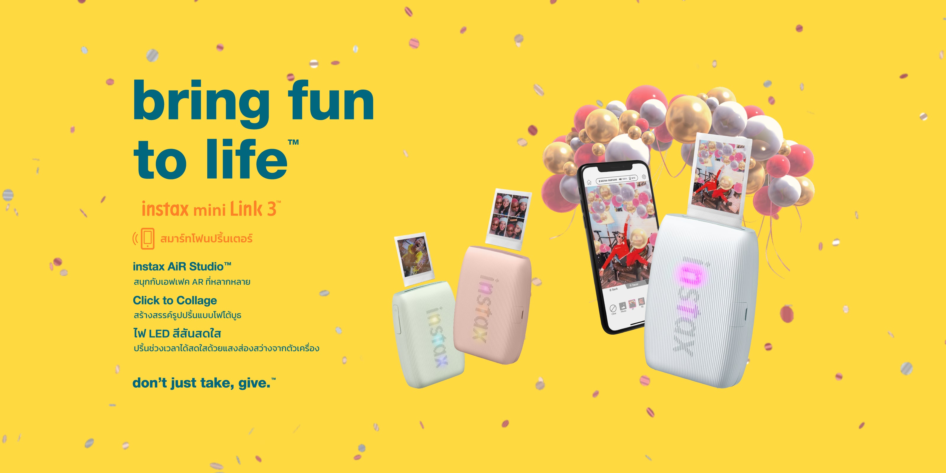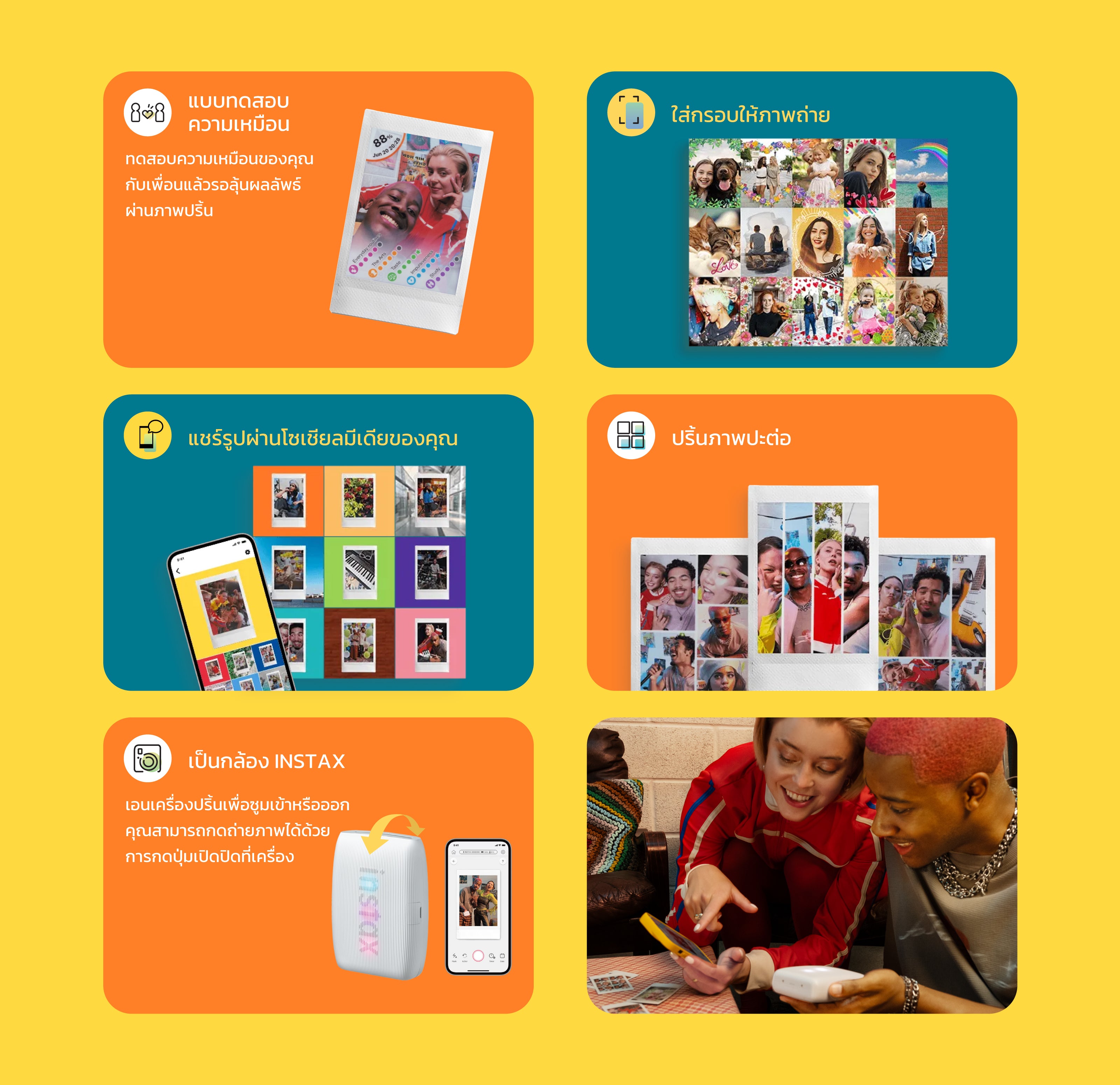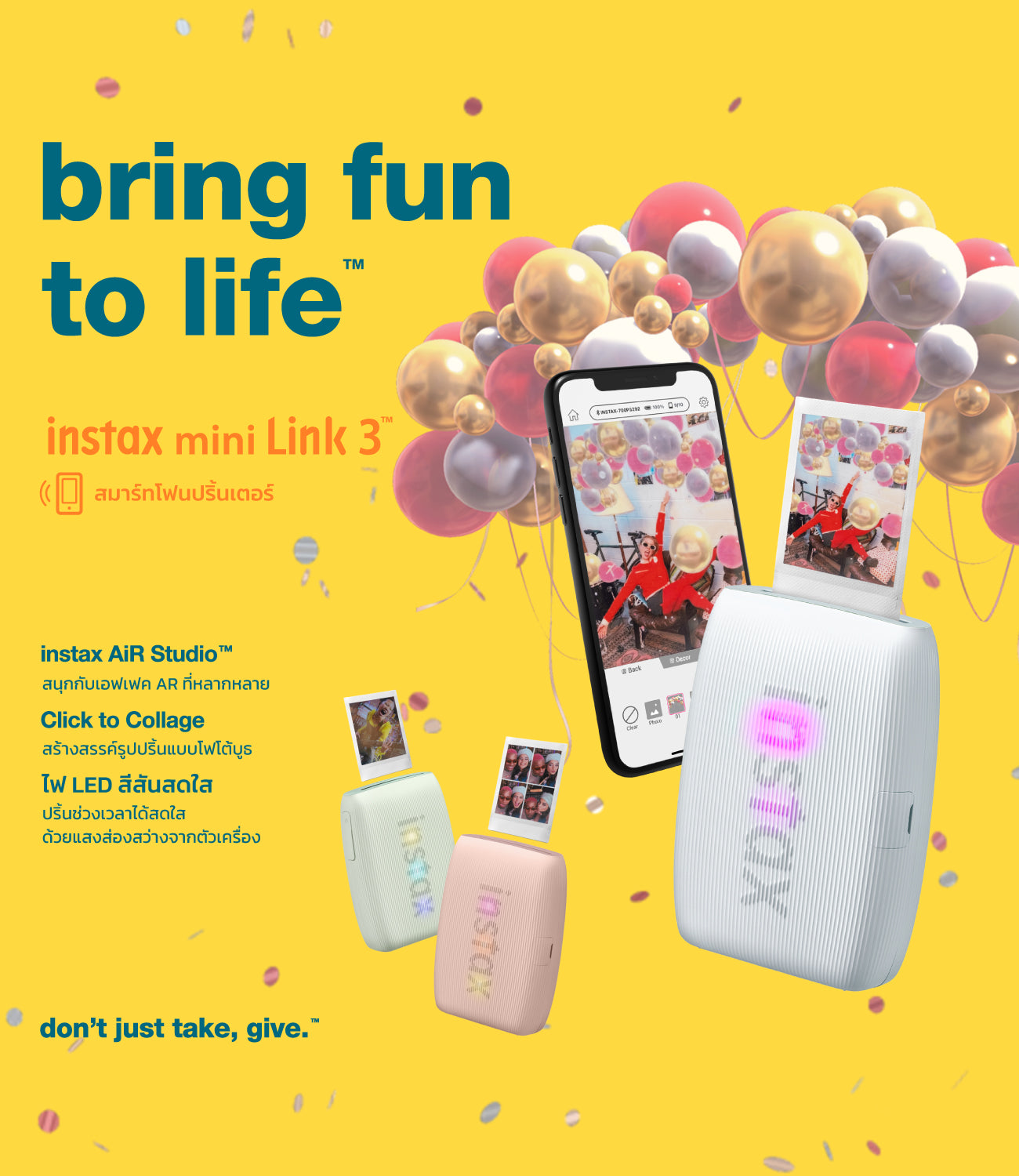 ปริ้นเตอร์สำหรับปริ้นฟิล์มขนาด mini สามารถปริ้นรูปฟิล์มจากมือถือได้ผ่านบลูทูธ ตกแต่งฟิล์มของคุณด้วยกรอบรูปและฟิลเตอร์น่ารักมากมาย โดดเด่นยิ่งขึ้นด้วย instax air studio ตกแต่งรูป AR 3 มิติได้เสมือนอยู่สตูดิโอ และ instax Click to collage ถ่ายรูปในช่วงเวลา 3 วินาที เหมือนโฟโต้บูธ และยังมีลูกเล่นอื่นๆอีกมากมาย