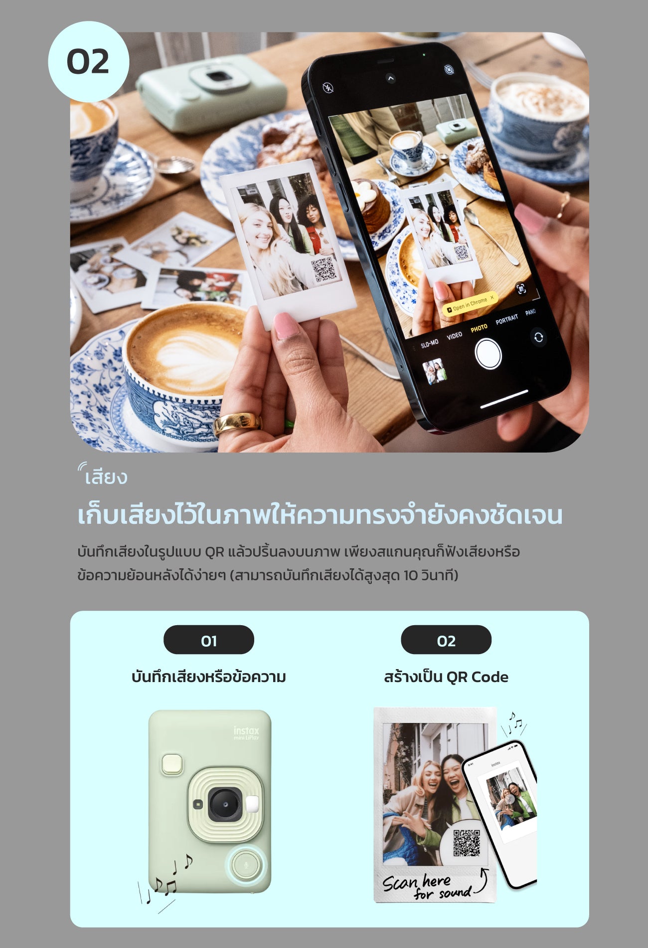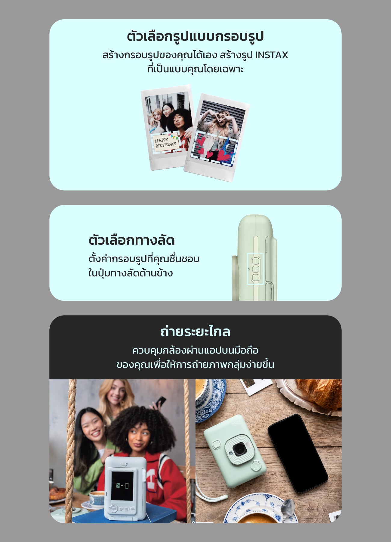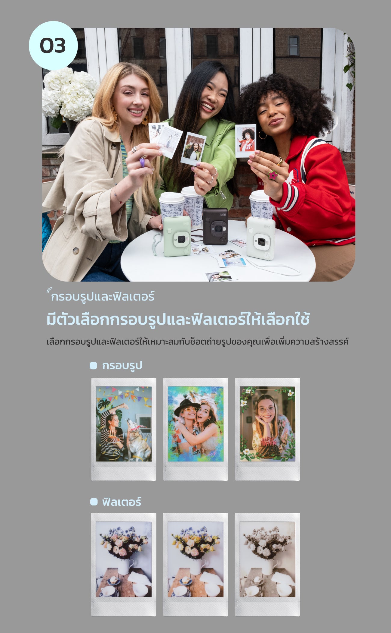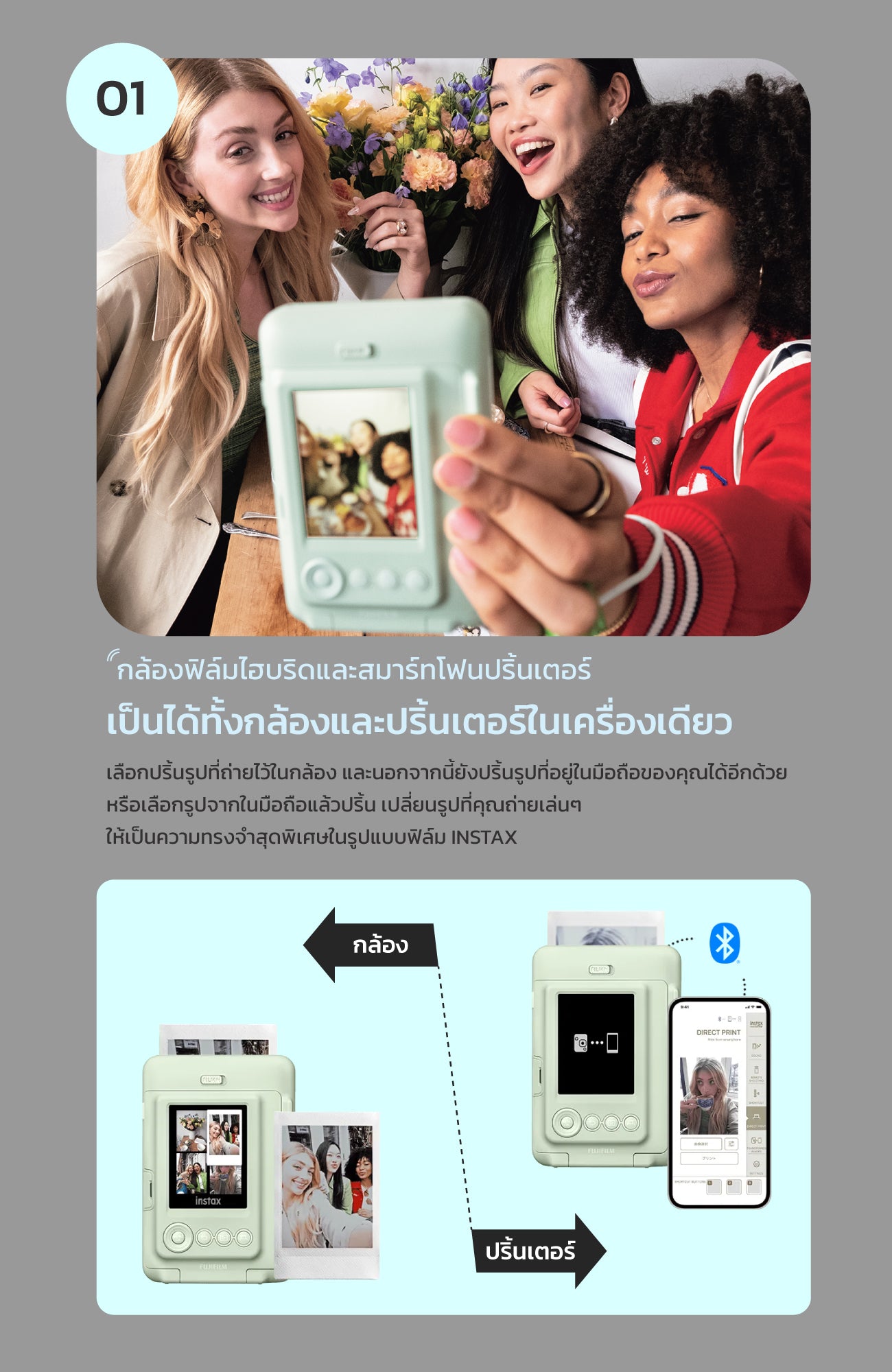 กล้องอินสแตนท์รูปแบบฟิล์มขนาด mini จะถ่ายหรือปริ้นก็ทำได้ง่ายๆผ่านบลูทูธ สามารถเลือกภาพที่จะปริ้นได้ หรือจะเลือกภาพจากช๊อต VDO ก็ทำได้ มาพร้อมฟิลเตอร์ฟิล์ม และกรอบรูปตกแต่งกว่า 30 แบบที่จะทำให้รูปฟิล์มของคุณโดดเด่นไม่ซ้ำใคร สามารถบันทึกเสียงในรูปแบบ QR code ได้บนภาพฟิล์ม