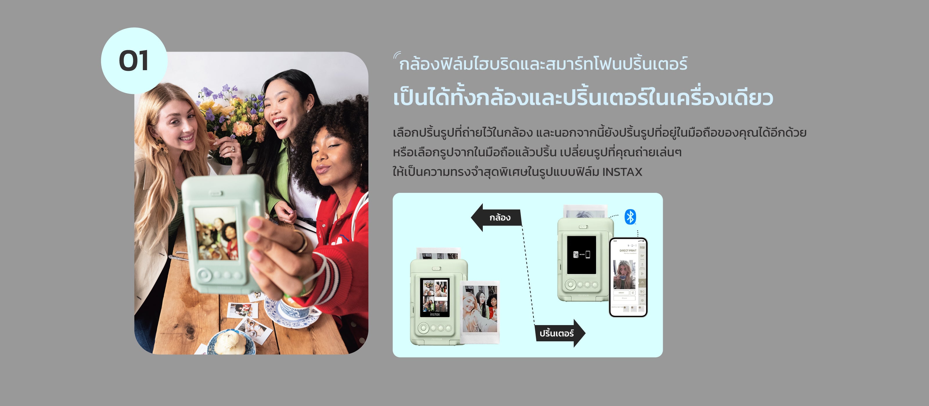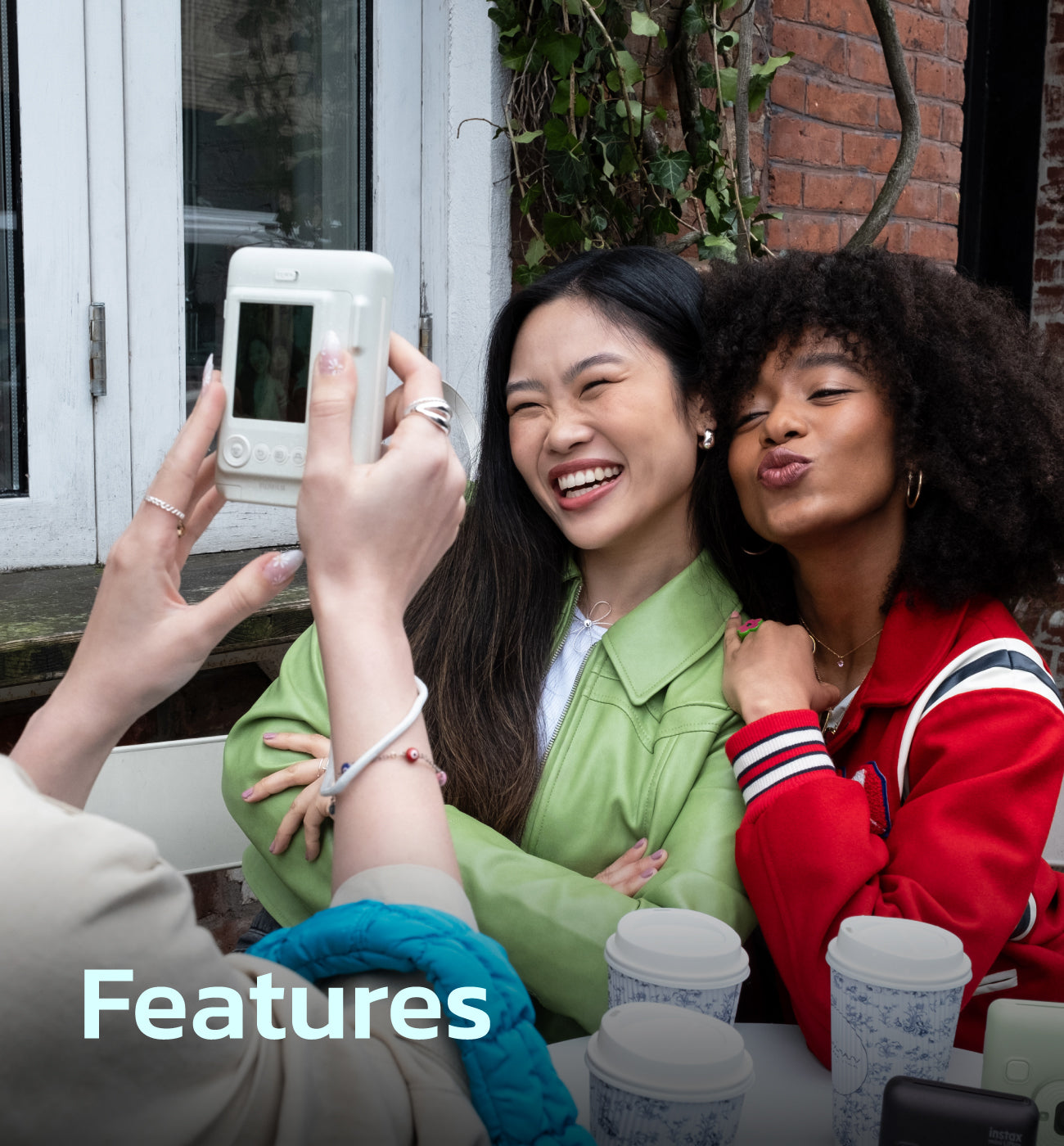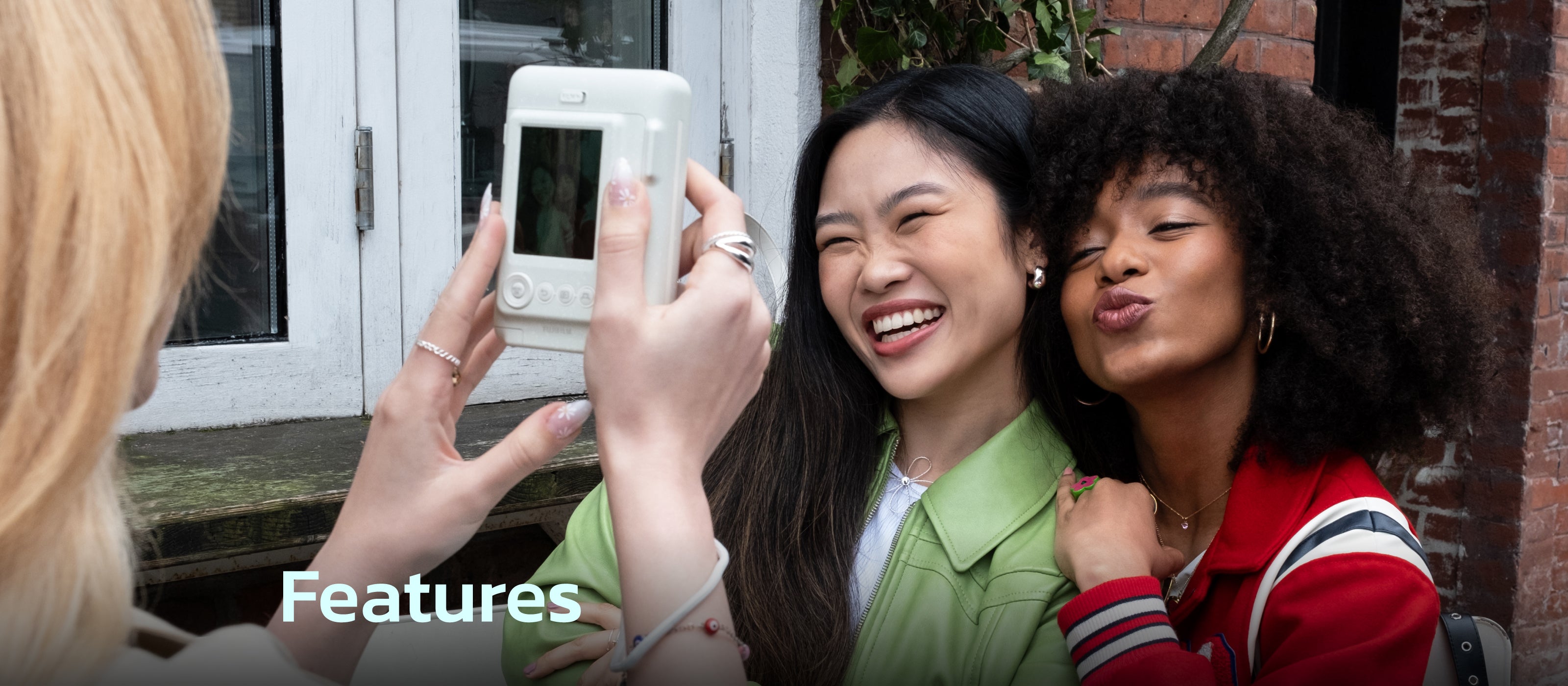 กล้องอินสแตนท์รูปแบบฟิล์มขนาด mini จะถ่ายหรือปริ้นก็ทำได้ง่ายๆผ่านบลูทูธ สามารถเลือกภาพที่จะปริ้นได้ หรือจะเลือกภาพจากช๊อต VDO ก็ทำได้ มาพร้อมฟิลเตอร์ฟิล์ม และกรอบรูปตกแต่งกว่า 30 แบบที่จะทำให้รูปฟิล์มของคุณโดดเด่นไม่ซ้ำใคร สามารถบันทึกเสียงในรูปแบบ QR code ได้บนภาพฟิล์ม
