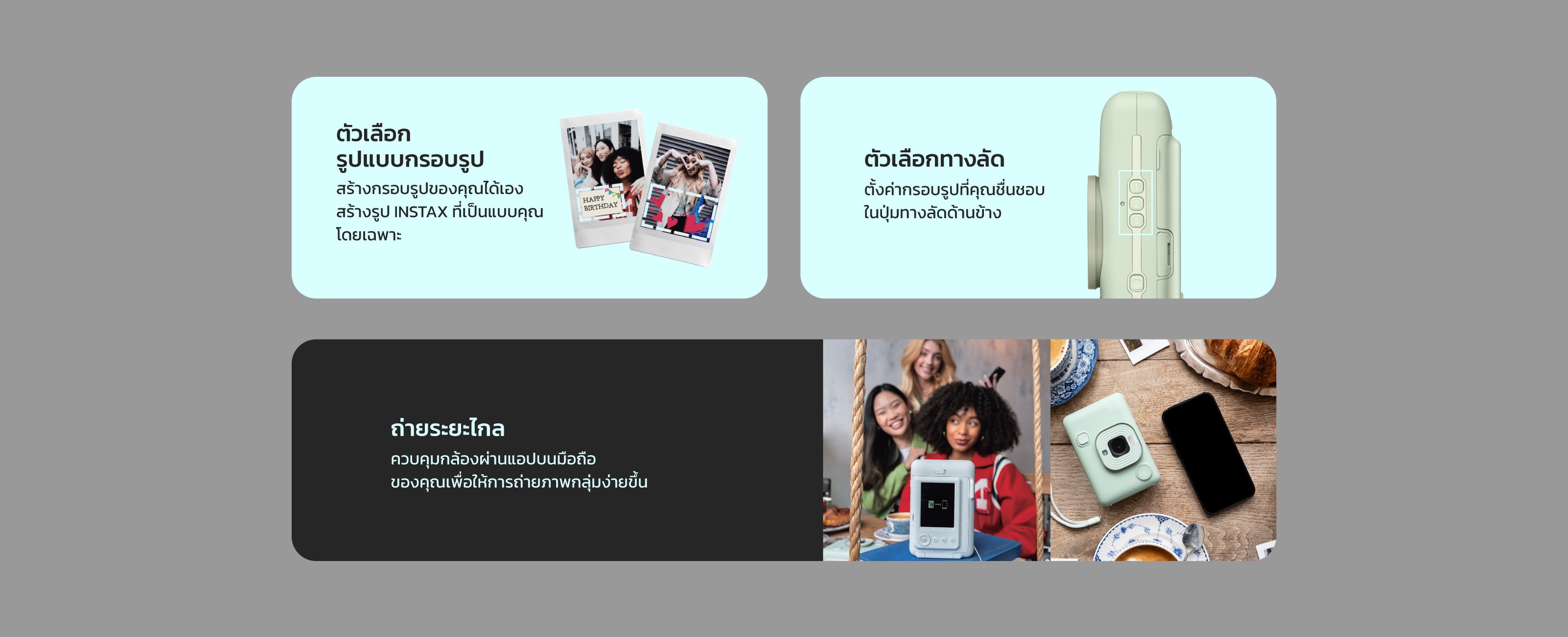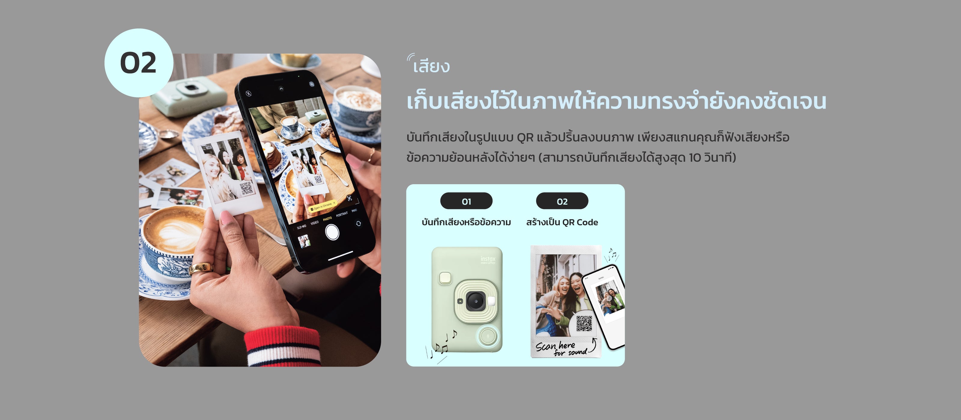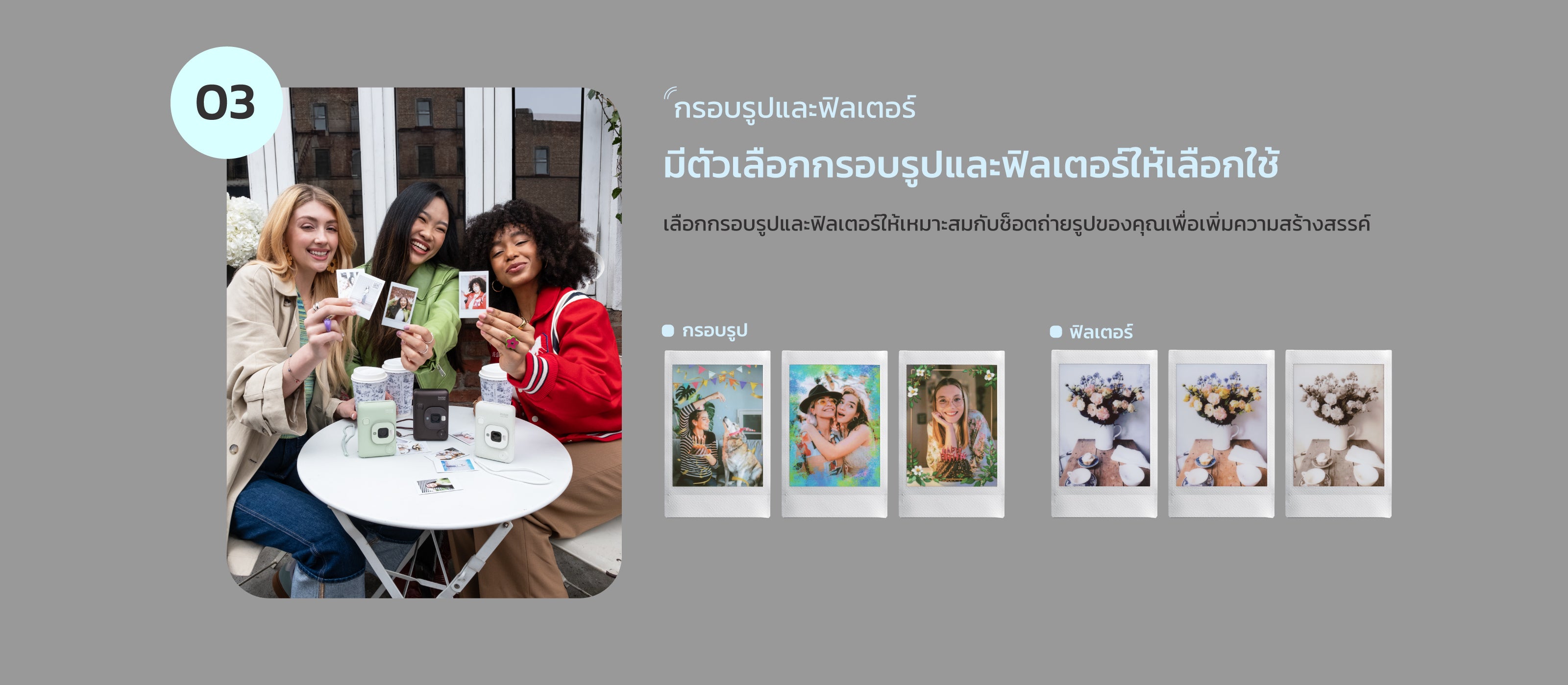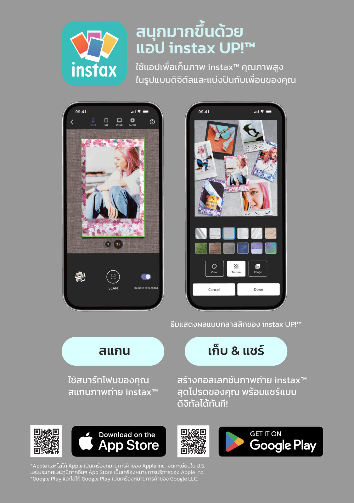 กล้องอินสแตนท์รูปแบบฟิล์มขนาด mini จะถ่ายหรือปริ้นก็ทำได้ง่ายๆผ่านบลูทูธ สามารถเลือกภาพที่จะปริ้นได้ หรือจะเลือกภาพจากช๊อต VDO ก็ทำได้ มาพร้อมฟิลเตอร์ฟิล์ม และกรอบรูปตกแต่งกว่า 30 แบบที่จะทำให้รูปฟิล์มของคุณโดดเด่นไม่ซ้ำใคร สามารถบันทึกเสียงในรูปแบบ QR code ได้บนภาพฟิล์ม