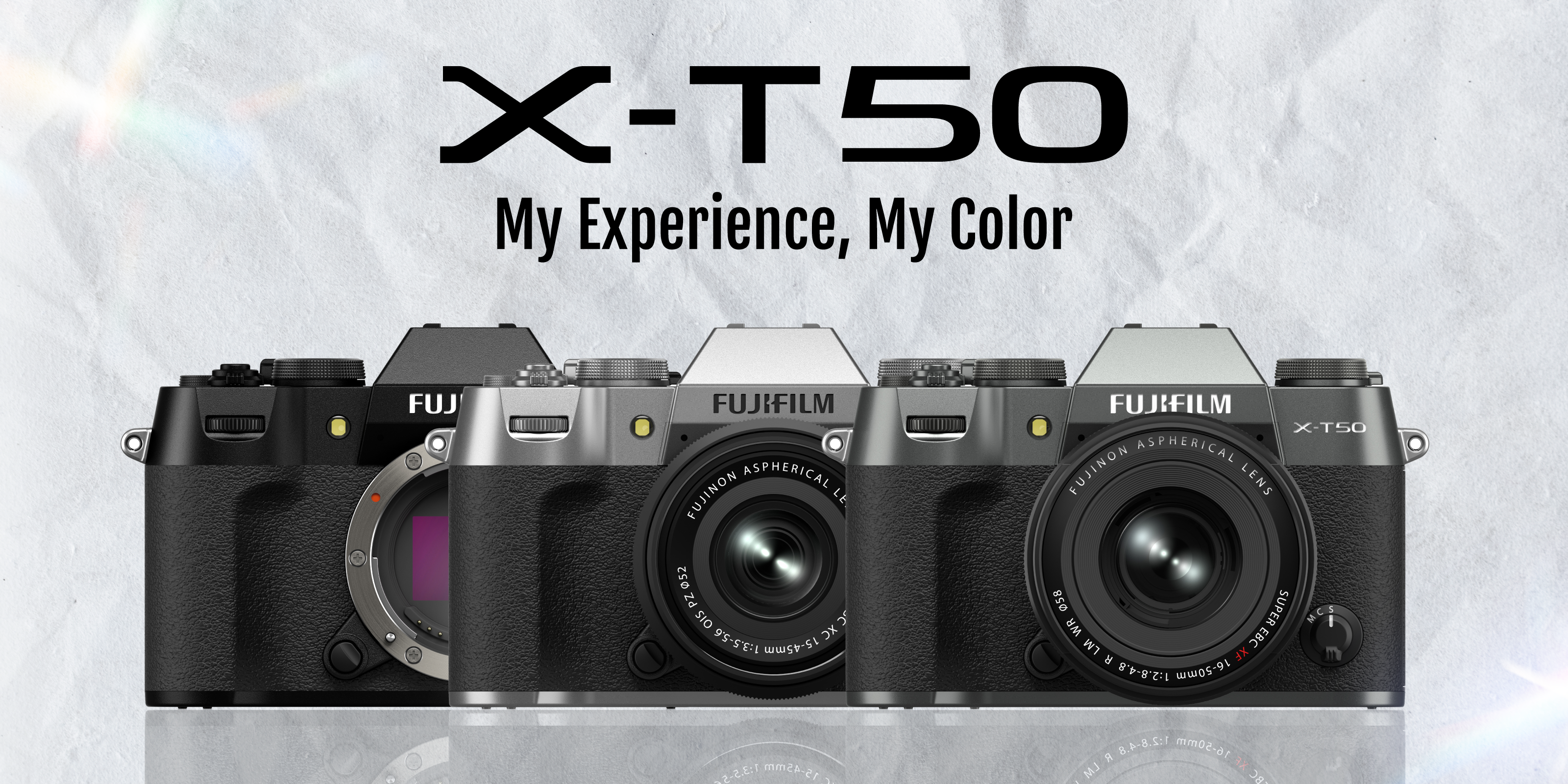 X-T50 มี 3 สีให้เลือก ประกอบด้วย Silver ดูหรูหราและทันสมัย, Black มีสไตล์เท่ห์และดูเป็นมืออาชีพ และ Charcoal Silver หลงใหลไปกับความคลาสสิกในโทนสีเทาเมทัลลิก ทั้ง 3 สีล้วนได้รับการออกแบบมาอย่างประณีตสวยงามและสมบูรณ์แบบ